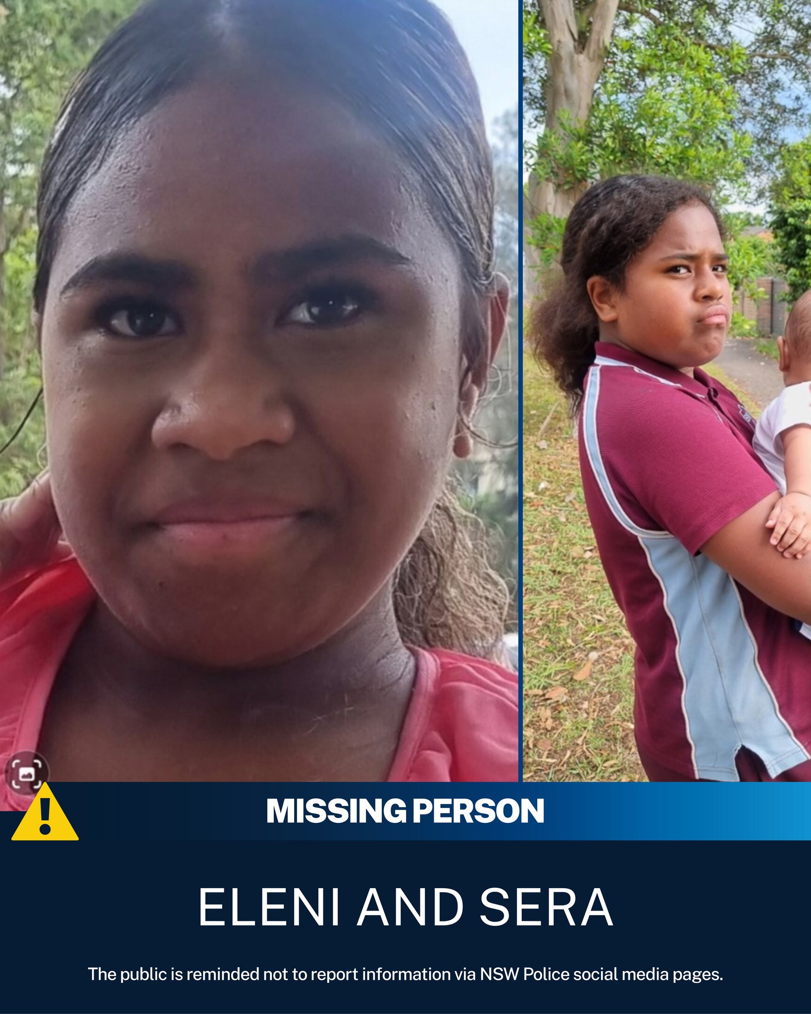 The New South Wales Police Force is appealing for public assistance to locate two teenage girls reported missing from Sydney’s south west. Eleni Baleinadi, 13, and her sister Sera Baleinadi, 11, were last seen together at a home on The Avenue in Yagoona at about 10pm on Monday, 26 January…