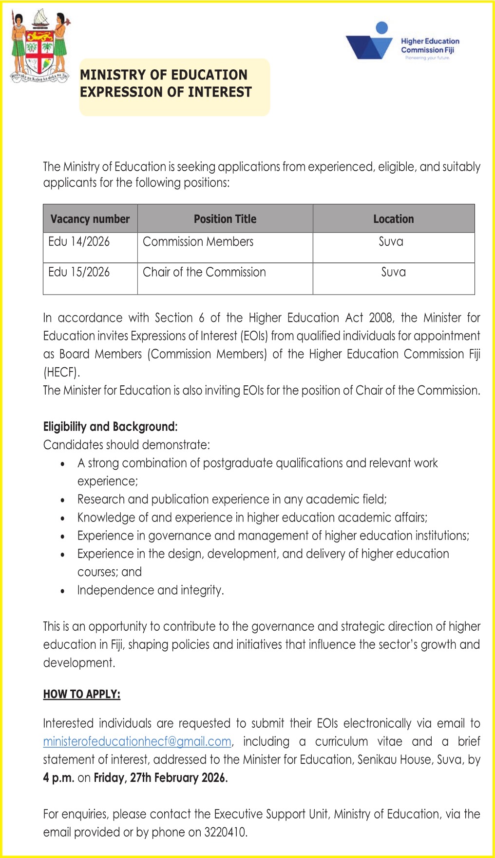 It has emerged that the appointment of the new chairperson of the Higher Education Commission Fiji has been made before the advertised closing date for expression of interest applications. According to a public advertisement, applications for the chairperson’s position were due to close on February 27, 2026. The position has…