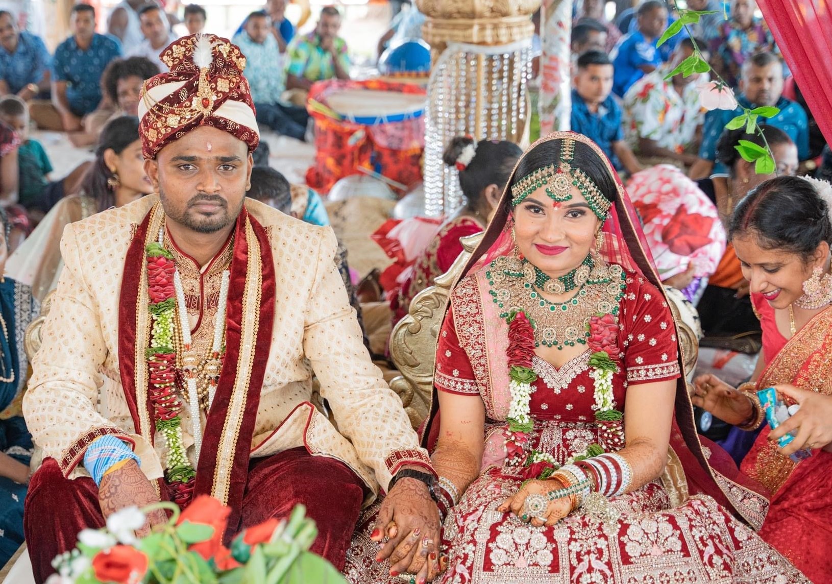 hivam and Sivanjani Raj are surrounded by family and friends at their wedding.