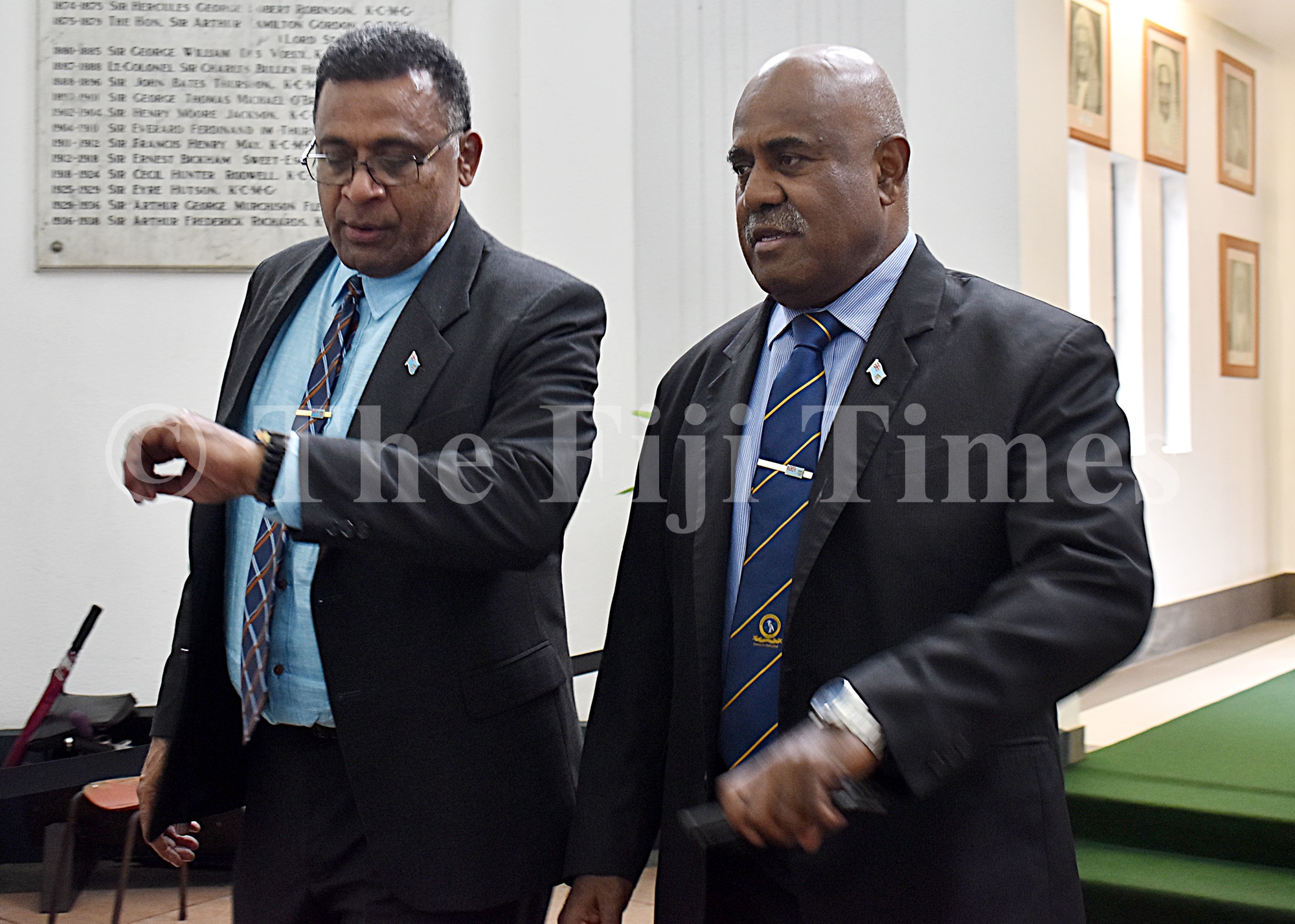 Esrom Immanuel, Assistant Minister for Ministry of Finance and Assistant Minister in the Prime Minister’s office, Sakiasi Tubuna during a break from parliament. Picture: FILE