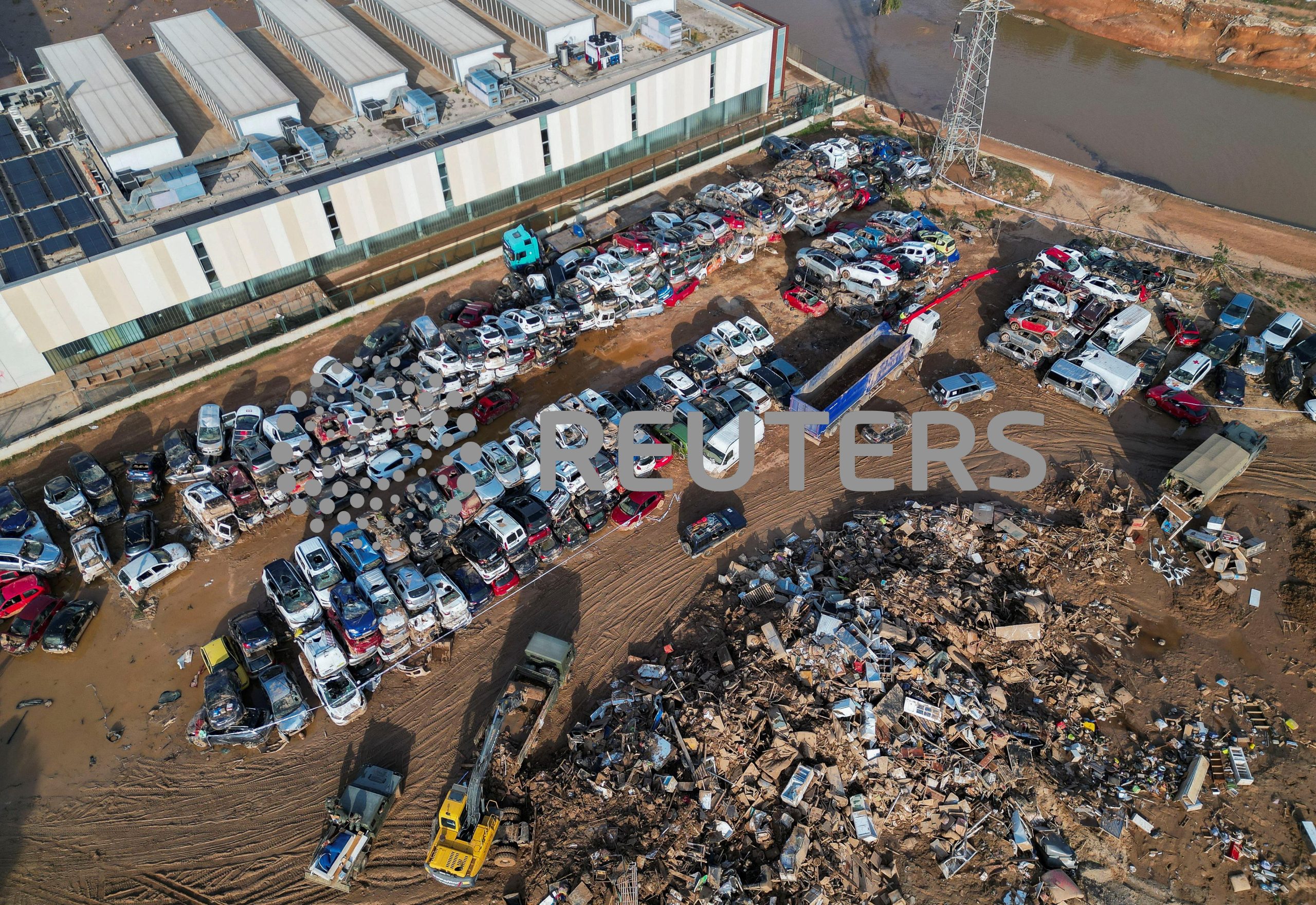 A drone view shows a cemetery of destroyed vehicles, following last week’s catastrophic flooding in Paiporta, Valencia, Spain, November 5, 2024. REUTERS/Manuel Ausloos