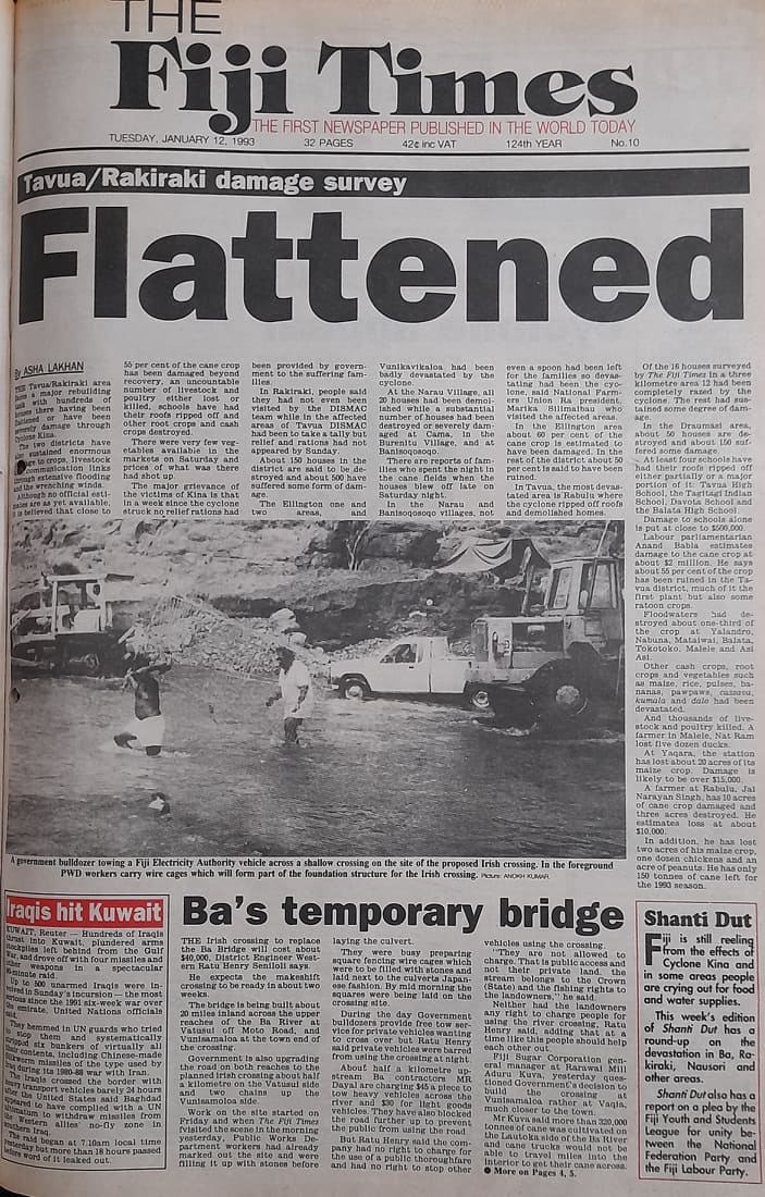 On this day, January 12 in 1993, The Fiji Times front page story was about the damages caused by Cyclone Kina.