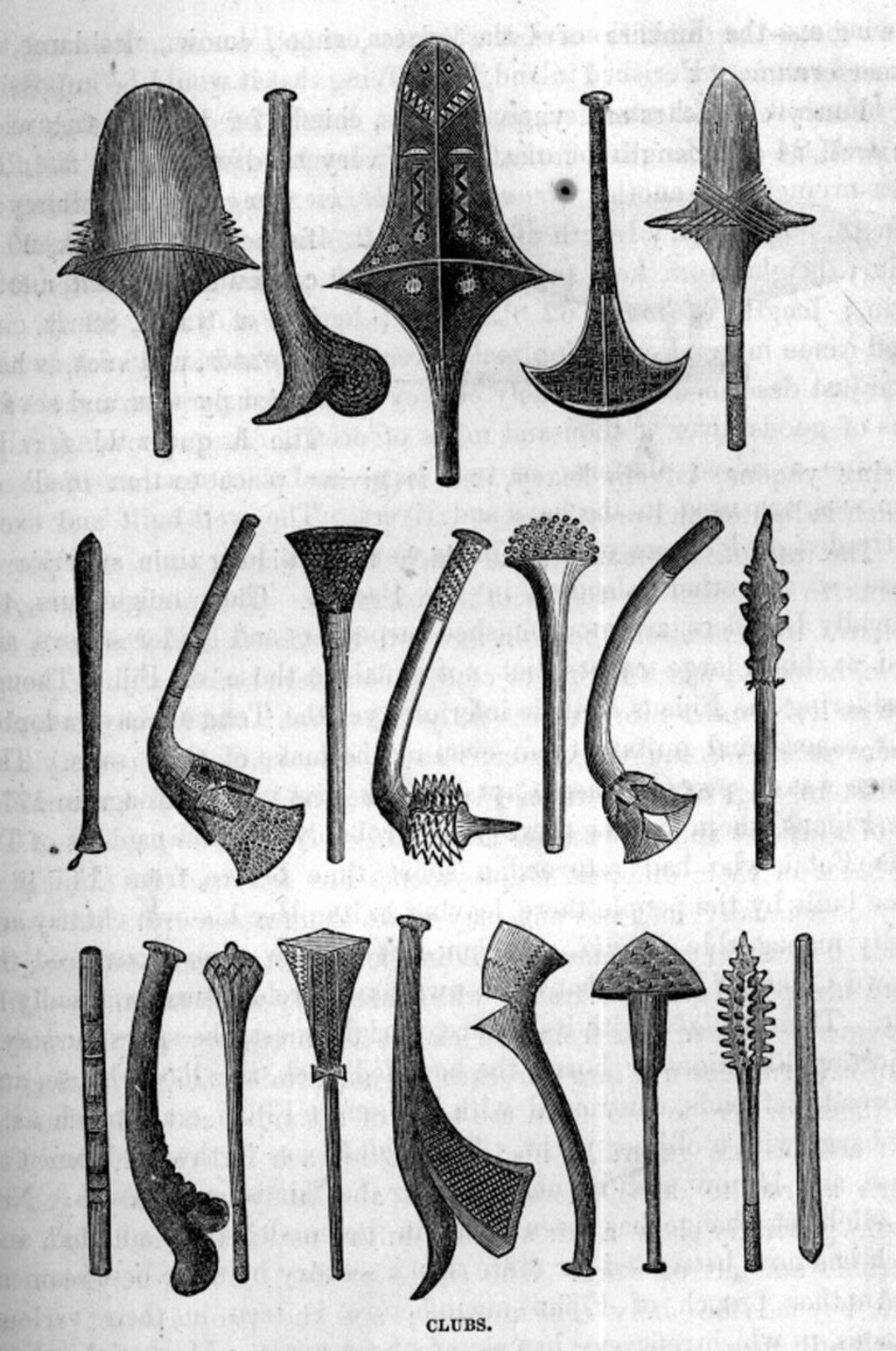 “On the other hand many were carved from slabs of hardwood split from the tree; others again were simple bludgeons, cut from the heartwood of selected trees and balanced with precision.”