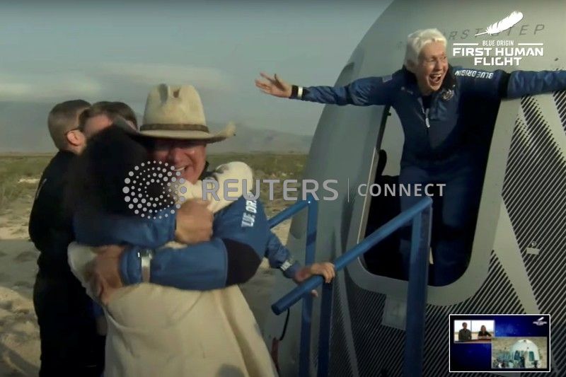 Billionaire businessman Jeff Bezos and pioneering female aviator Wally Funk emerge from their capsule after their flight aboard Blue Origin’s New Shepard rocket on the world’s first unpiloted suborbital flight near Van Horn, Texas, U.S., July 20, 2021 in a still image from video. Blue Origin/Handout via REUTERS.