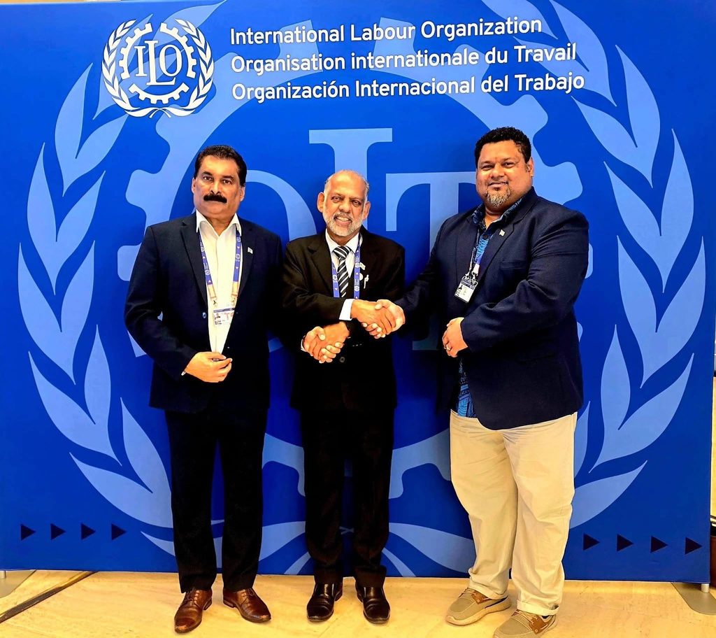 FCEF CEO Edward Bernard, right, with Fiji Government and workers’ representatives at the 2025 International Labour Conference. Picture: SUPPLIED
