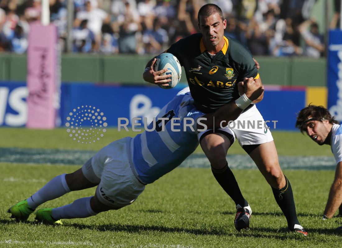 FILE PHOTO: South Africa’s Ruan Pienaar is tackled by Argentina’s Juan Manuel Leguizamon (L) during their Rugby Championship match at the Padre Ernesto Martearena stadium in Salta August 23, 2014. REUTERS/Enrique Marcarian/File Photo