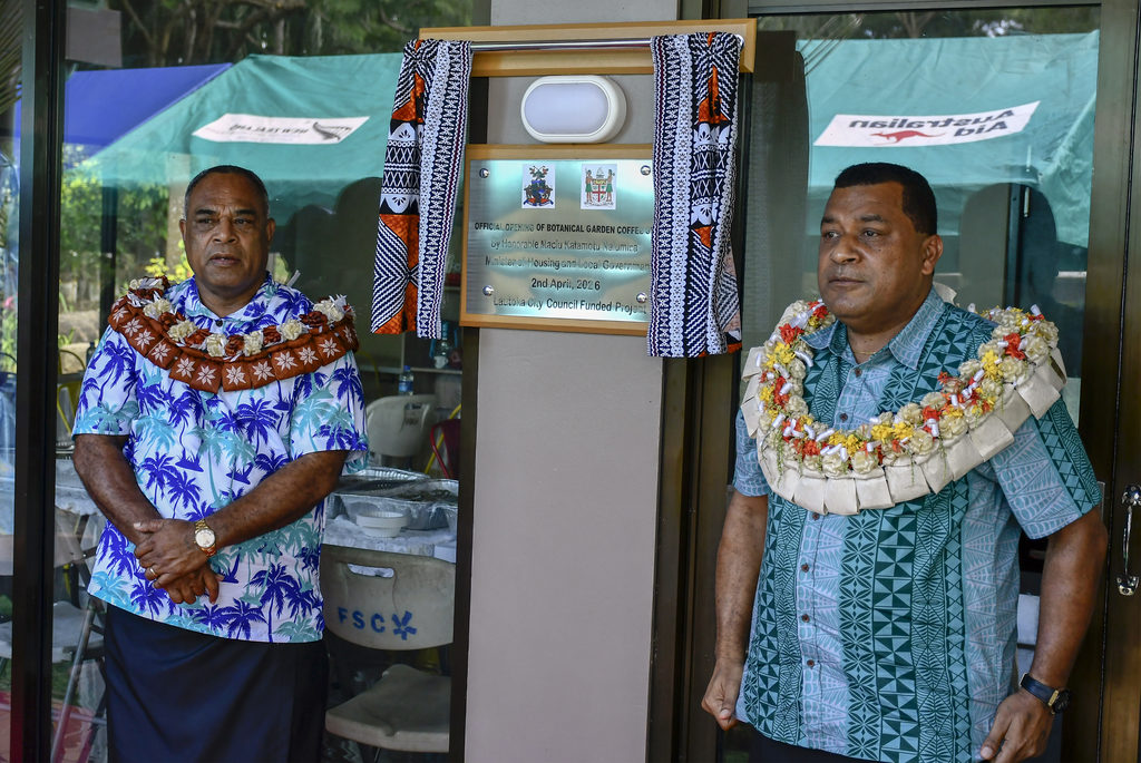Minister for Local Government Maciu Nalumisa and Tui Vitogo, Ratu Jone Sovasova during the opening of the Botanical Garden Coffee Shop in Lautoka. Picture: BALJEET SINGH