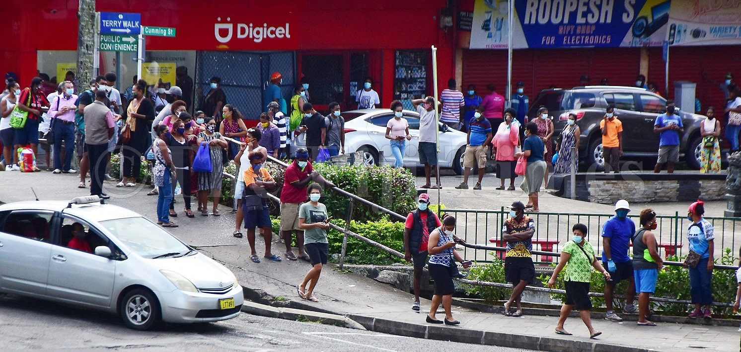 Members of the public stand in a line from Cumming St towards Thomson St in Suva yesterday. World Health Organization director-general Dr Tedros Adhanom Ghebreyesus has urged people to avoid contact as much as possible during the COVID-19 pandemic. Picture: ATU RASEA