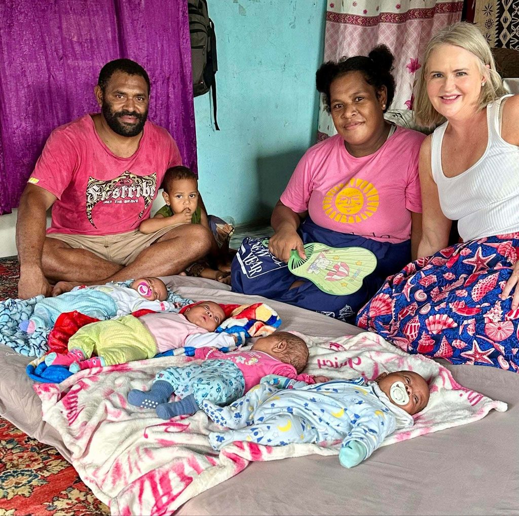 Titila, her husband, their friend, Jo Carter and the quadruplets. Picture: SUPPLIED
