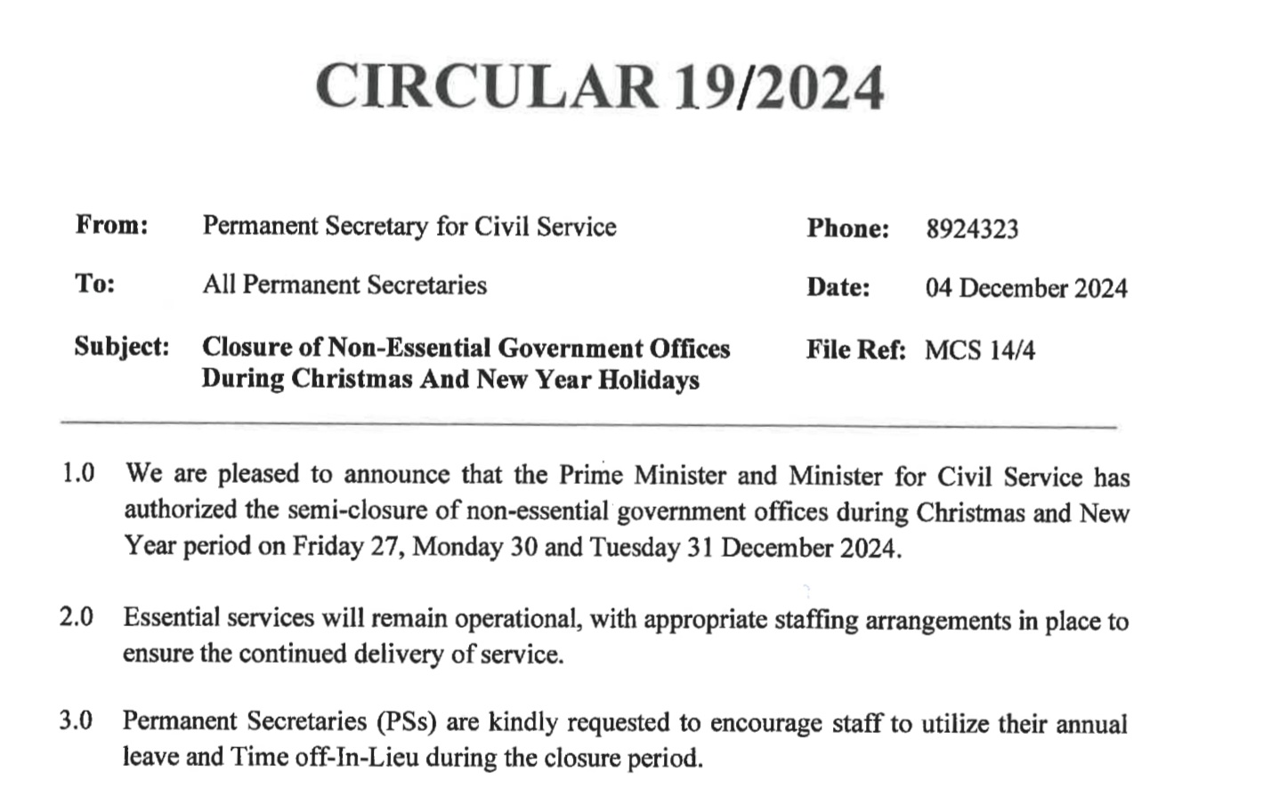 Government has announced that all non-essential Government services will be temporarily closed for the Christmas and New Year’s holidays from Friday 27, Monday 30 and Tuesday, 31 December 2024.