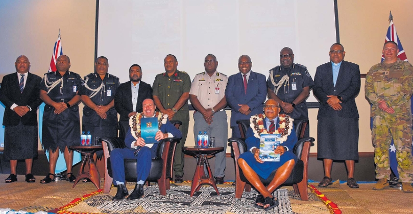 Australian High Commissioner to Fiji Peter Roberts, left, and Prime Minister Sitiveni Rabuka with members of the Australian and Fiji’s disciplined forces during the launch at Grand Pacific Hotel in Suva. Picture: KATA KOLI