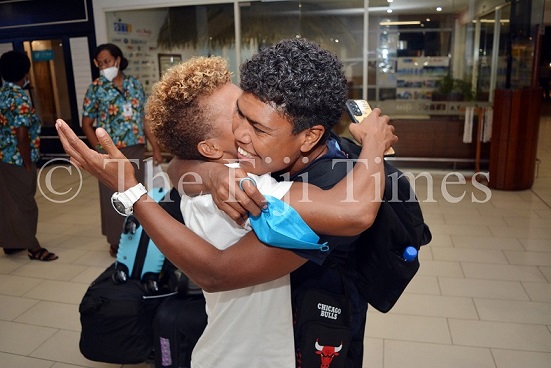 Mereula Torooti welcomes Rusila Nagasau at the Nadi International Airport on Sunday night. Picture: BALJEET SINGH