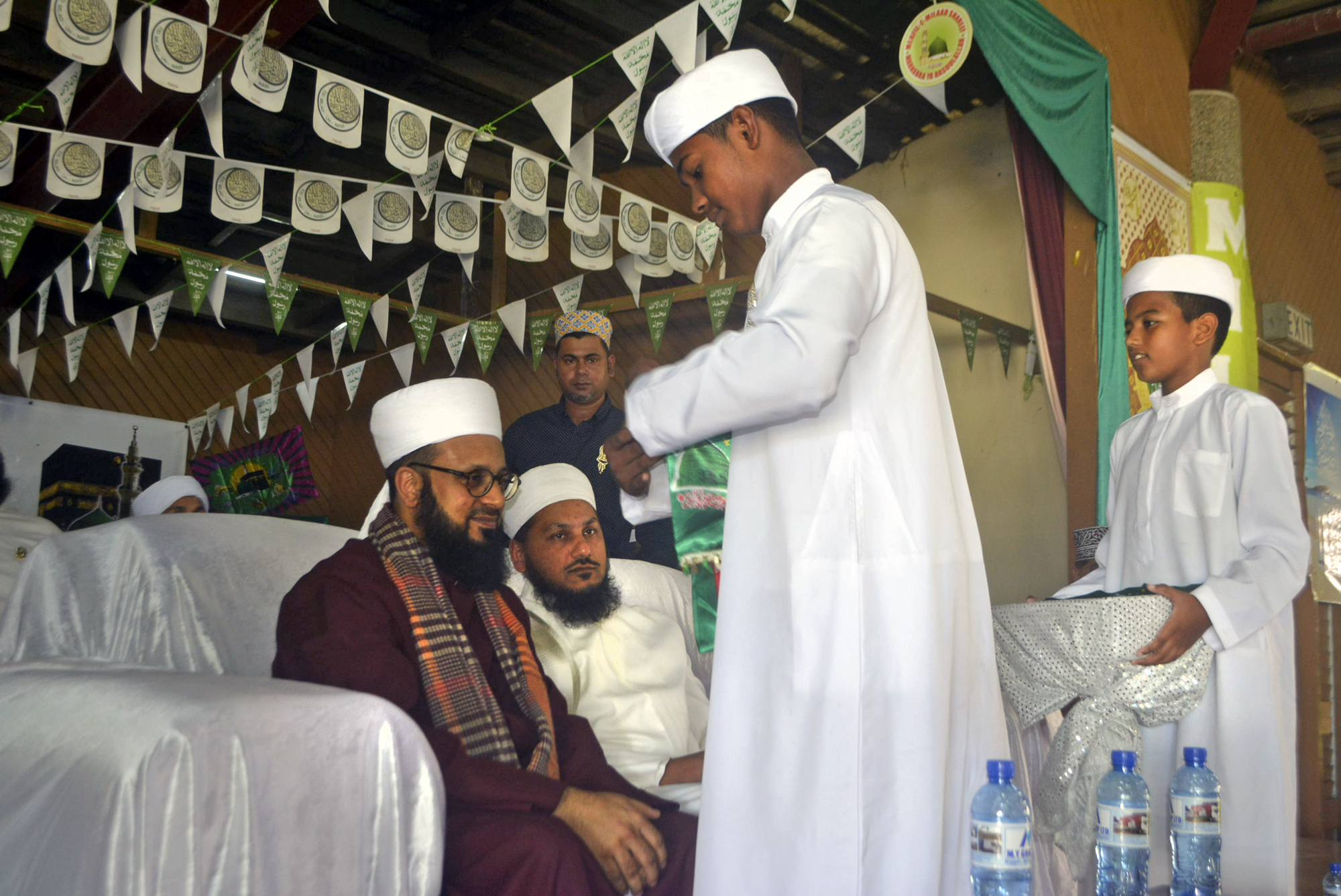 Imam Suyuti Foundation Principal Maulana Zainul Aqtab Siddique (left) and Maulana Mohammed Faizel Madarun receives a token of appreciation from Ma’unatul Islam Association of Fiji during the Prophet Mohammed Birthday Celebrations in Lautoka this morning. Picture: REINAL CHAND