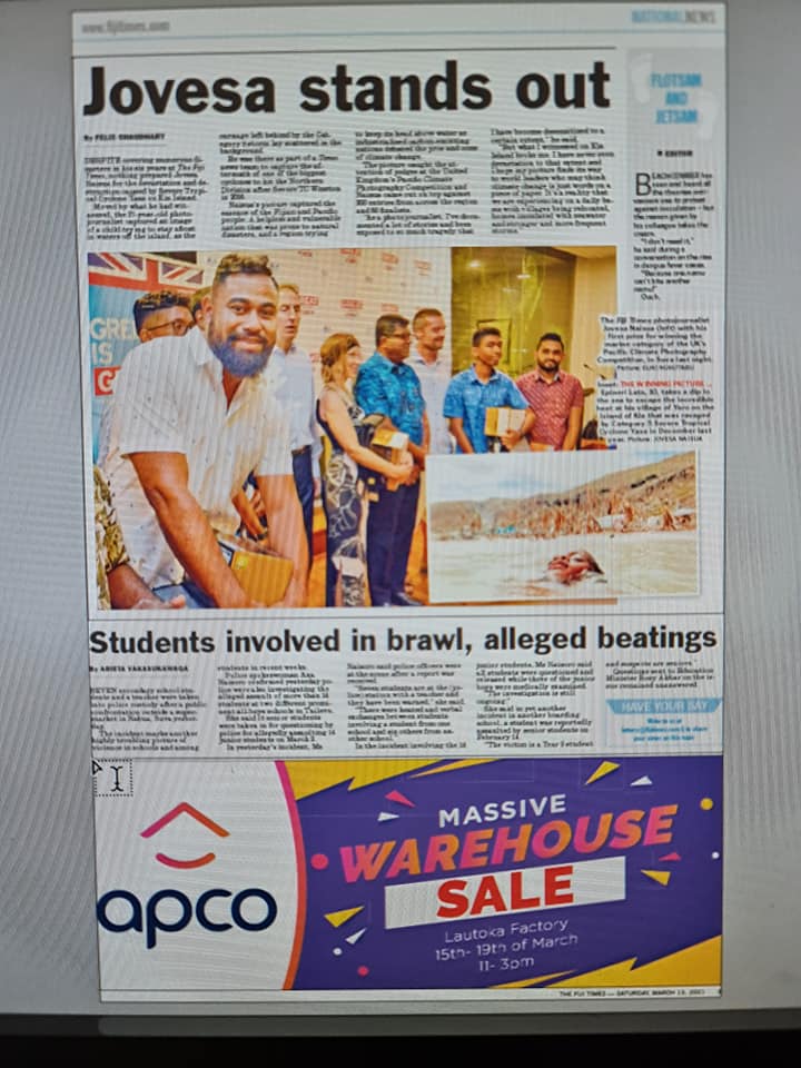 DESPITE covering numerous disasters in his six years at The Fiji Times, nothing prepared Jovesa Naisua for the devastation and destruction caused by Severe Tropical Cyclone Yasa on Kia Island. Moved by what he had witnessed, the 27-year-old photojournalist captured an image of a child trying to stay afloat in waters off the island, as the carnage left behind by the Category 5 storm lay scattered in the background.