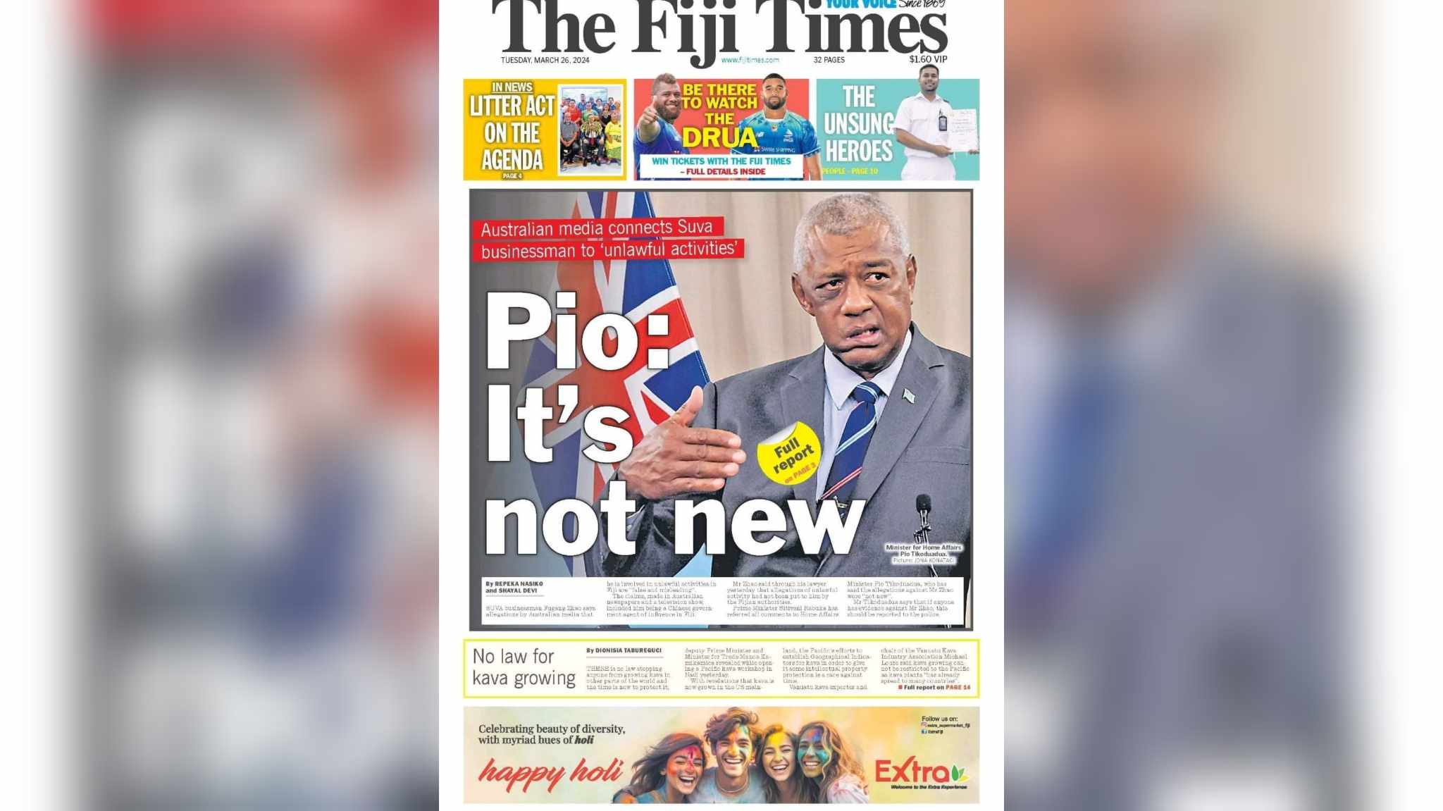 Mr Zhao said through his lawyer yesterday that allegations of unlawful activity had not been put to him by the Fiji authorities. That’s the lead news on Page 1 of The Fiji Times for Tuesday, March 26.