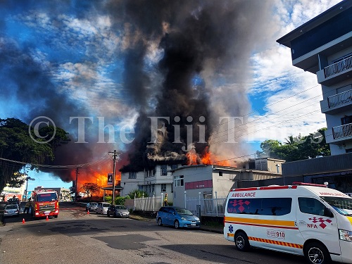 Fire engulfs the Defence Club building at the junction of MacArthur and Gordon streets in Suva yesterday. Picture: ELIKI NUKUTABU
