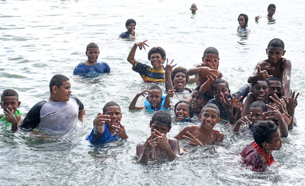 Children from Lami area poses for a photograph during their holiday swim in Lami on Wednesday. Picture: KATA KOLI