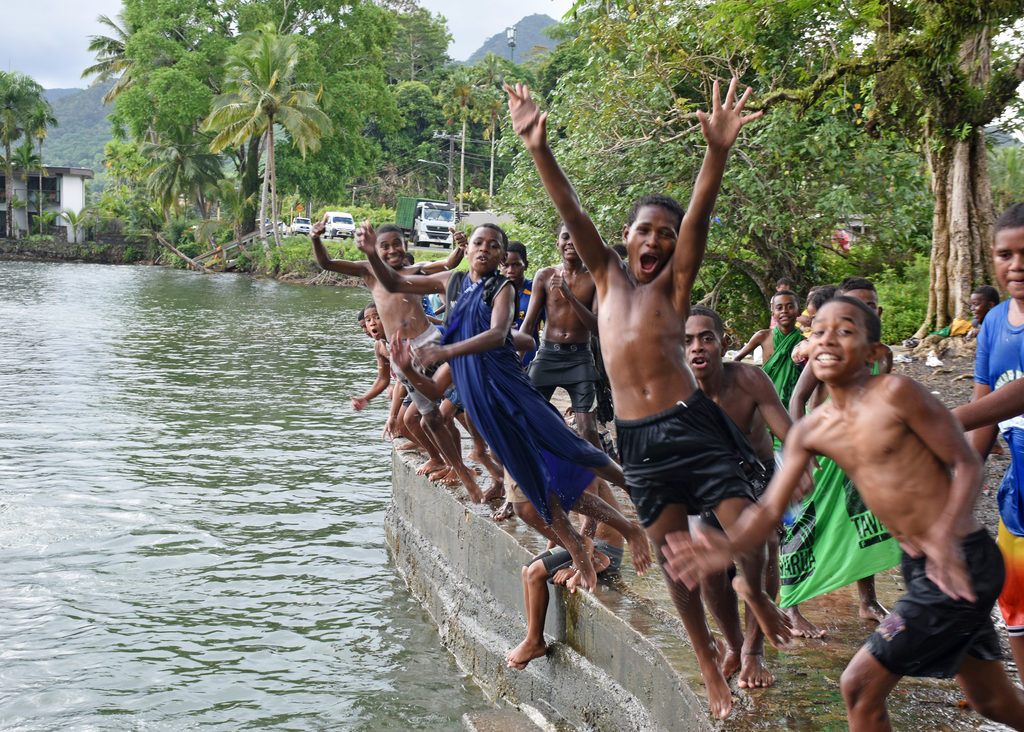 Children enjoy the school break at the Lami swimming spot on Wednesday. Picture: KATA KOLI