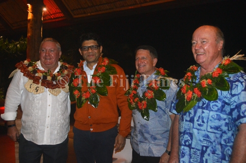 Outrigger Fiji Beach Resort General Manager Peter Hopgood (left) with Attorney General Aiyaz Sayed Khaiyum, Outrigger Enterprises Group President and CEO Jeff Wagoner and Tourism Industry Pioneer Geoffrey Shaw during his farewell ceremony on Friday Night. Picture: SHAYAL DEVI