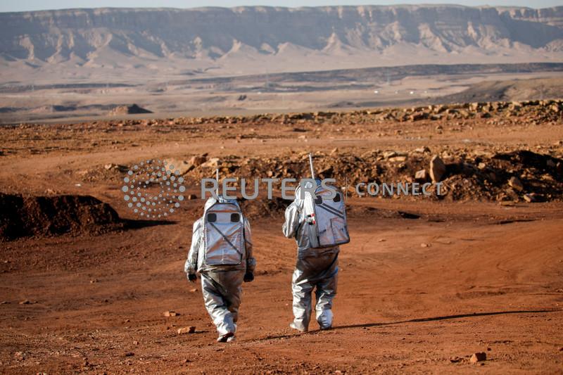 RAMON CRATER, Israel (Reuters) – From the door of the expedition base, a few small steps to the left an autonomous rover passes by. A few giant leaps to the right is an array of solar panels. The landscape is rocky, hilly, tinged with red. Purposefully it resembles Mars.
