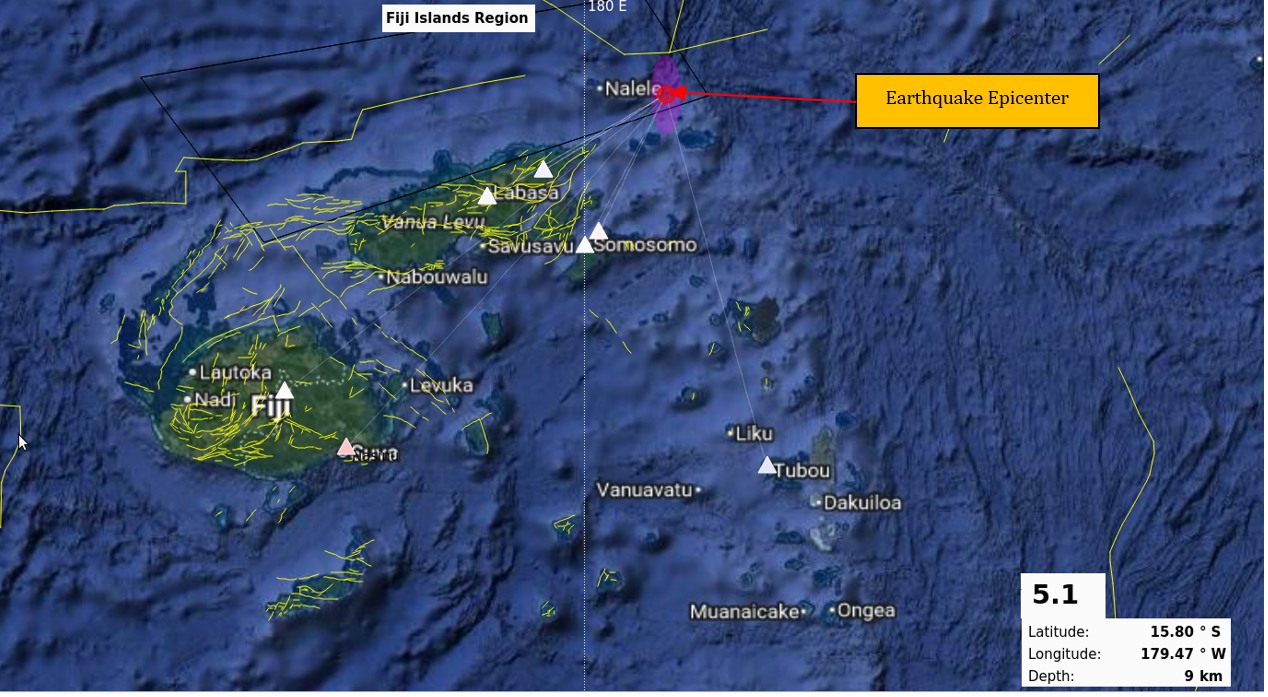 The Fiji Seismology Section states an earthquake measuring magnitude 5.1 was recorded approximately 41 kilometers east-southeast of Nalele Village on Cikobia Island.