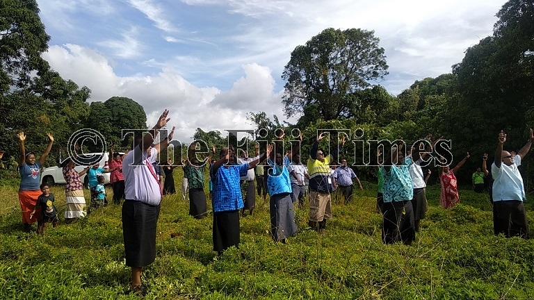 Minister for Forestry Osea Naiqamu (front row, second from left) cheer with civil servants and Vatulovona youths after planting 250 trees. Picture SERAFINA SILAITOGA