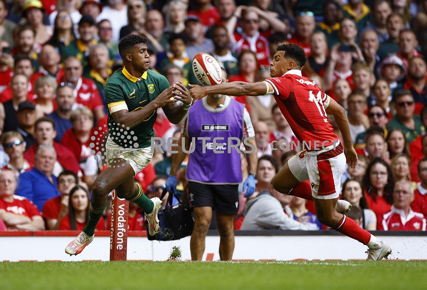 Rugby Union – Wales v South Africa – World Cup warm-up – Principality Stadium, Cardiff, Wales, Britain – August 19, 2023 South Africa’s Canan Moodie in action with Wales’ Rio Dyer leading to a penalty to South Africa Action Images via Reuters/John Sibley