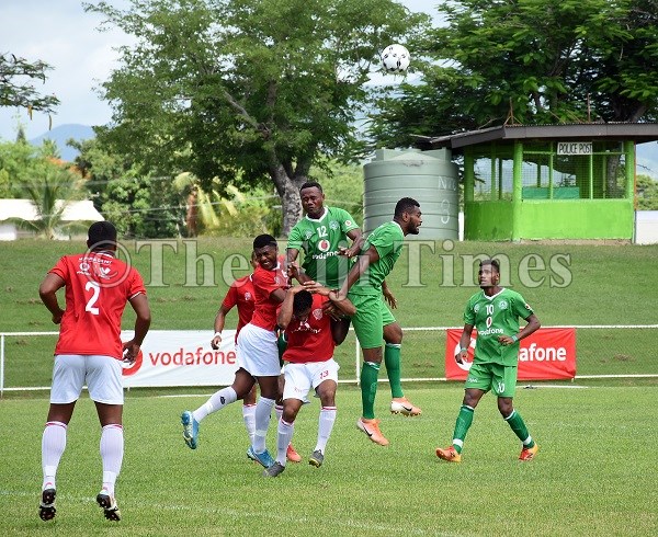 Rewa defenders work hard to stop Nadi players Ame Votoniu and Rusiate Matarerega from utilizing the cross ball during their match in the Vodafone Premier League at Prince Charles Park in Nadi. Picture: REINAL CHAND/FILE
