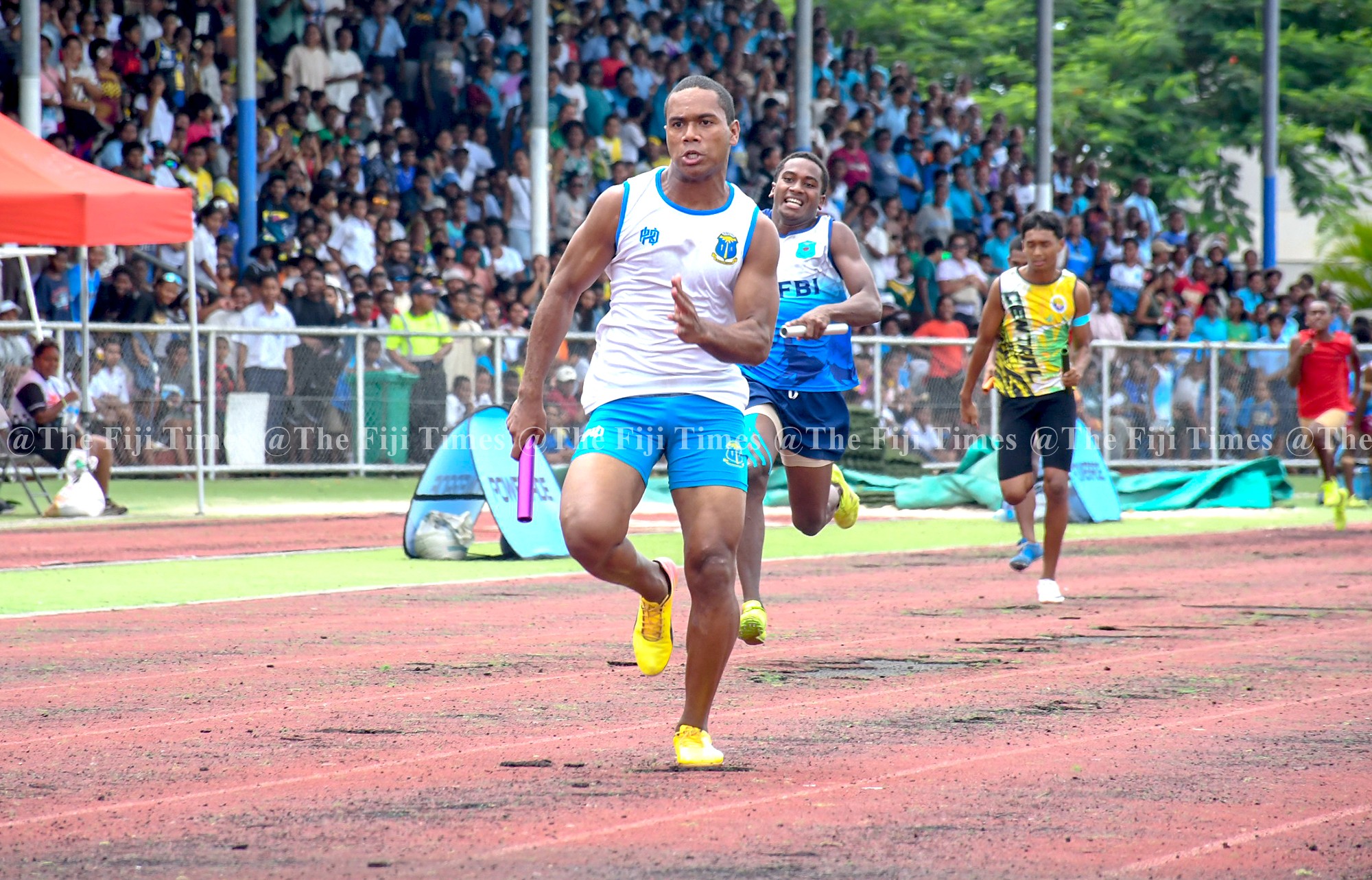 Natabua High School athlete Maciu Dawai compete in the Intermediate Boys 4x100m relay final during the Coca Cola Lautoka Zone Meet at Churchill Park on 31st March 2026. Picture: REINAL CHAND