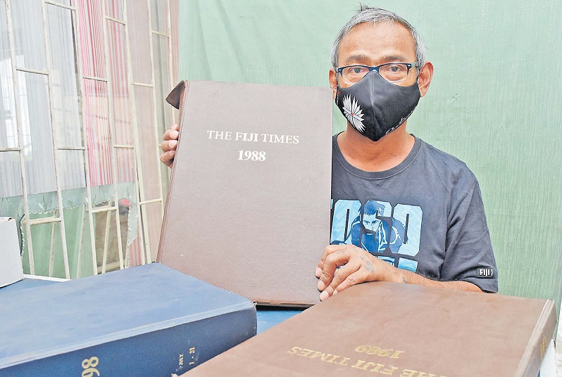Avid reader Allen Lockington flips through some of the old collection of The Fiji Times newspapers at his home in Lautoka. Picture: REINAL CHAND