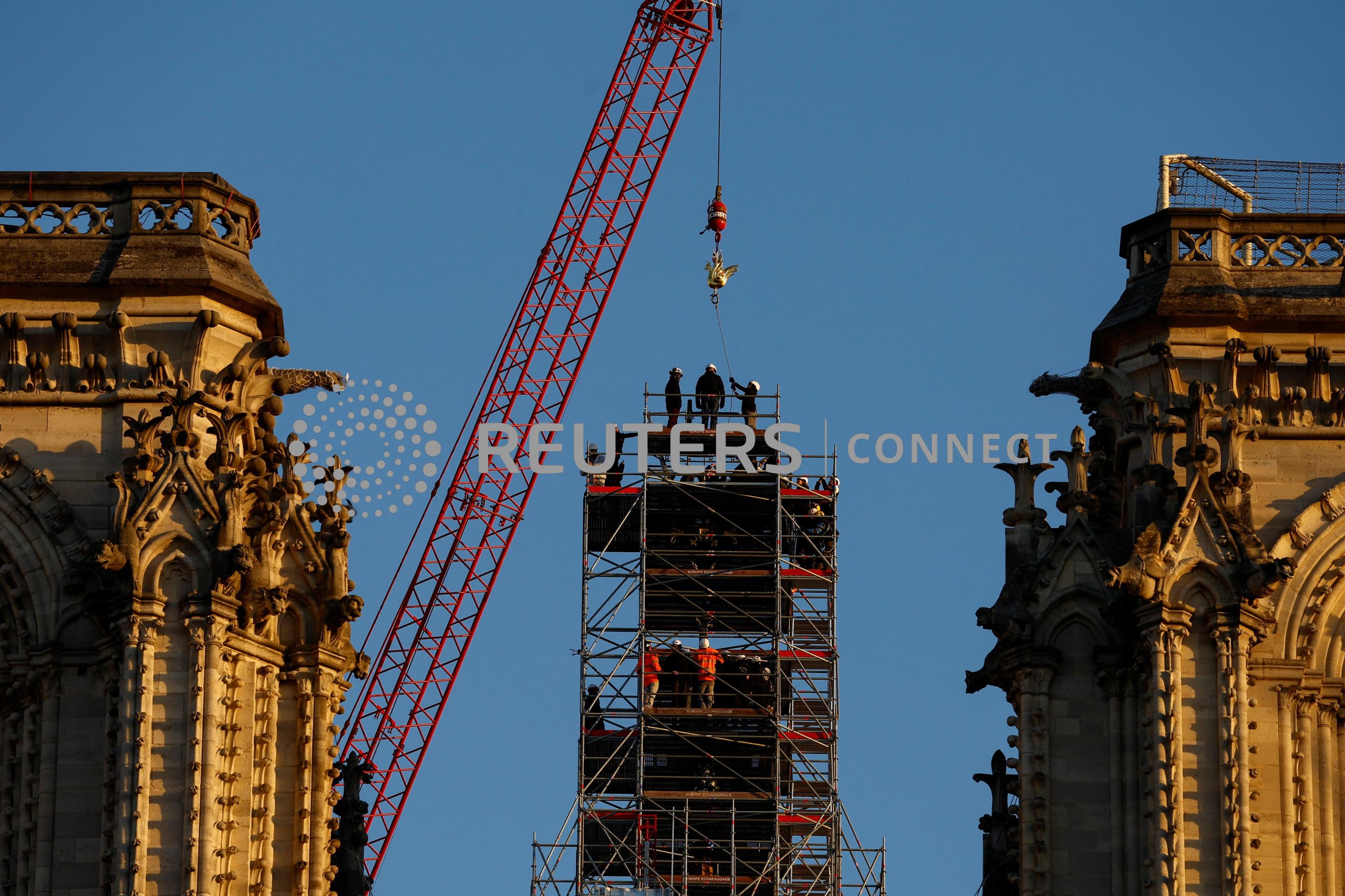 PARIS (Reuters) – A large crane hoisted a new copper rooster back to the top of the spire of Notre-Dame on Saturday, a meaningful milestone as workers race to finish renovating the fire-damaged Paris cathedral in the next twelve months.