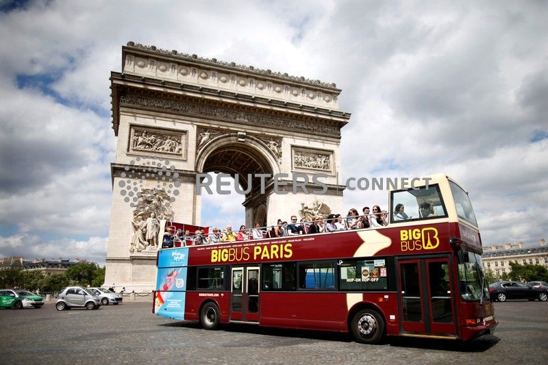 FILE PHOTO: Tourists ride in an open-air double-decker bus past the Arc de Triomphe in Paris, France, May 30, 2017. REUTERS/Charles Platiau/File Photo