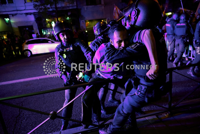 Spanish riot police officers detain a person during a protest near to Spain’s Socialists Party (PSOE) headquarters, following acting PM Pedro Sanchez negotiations for granting an amnesty to people involved with Catalonia’s failed 2017 independence bid in Madrid, Spain, November 6, 2023. REUTERS/Juan Medina