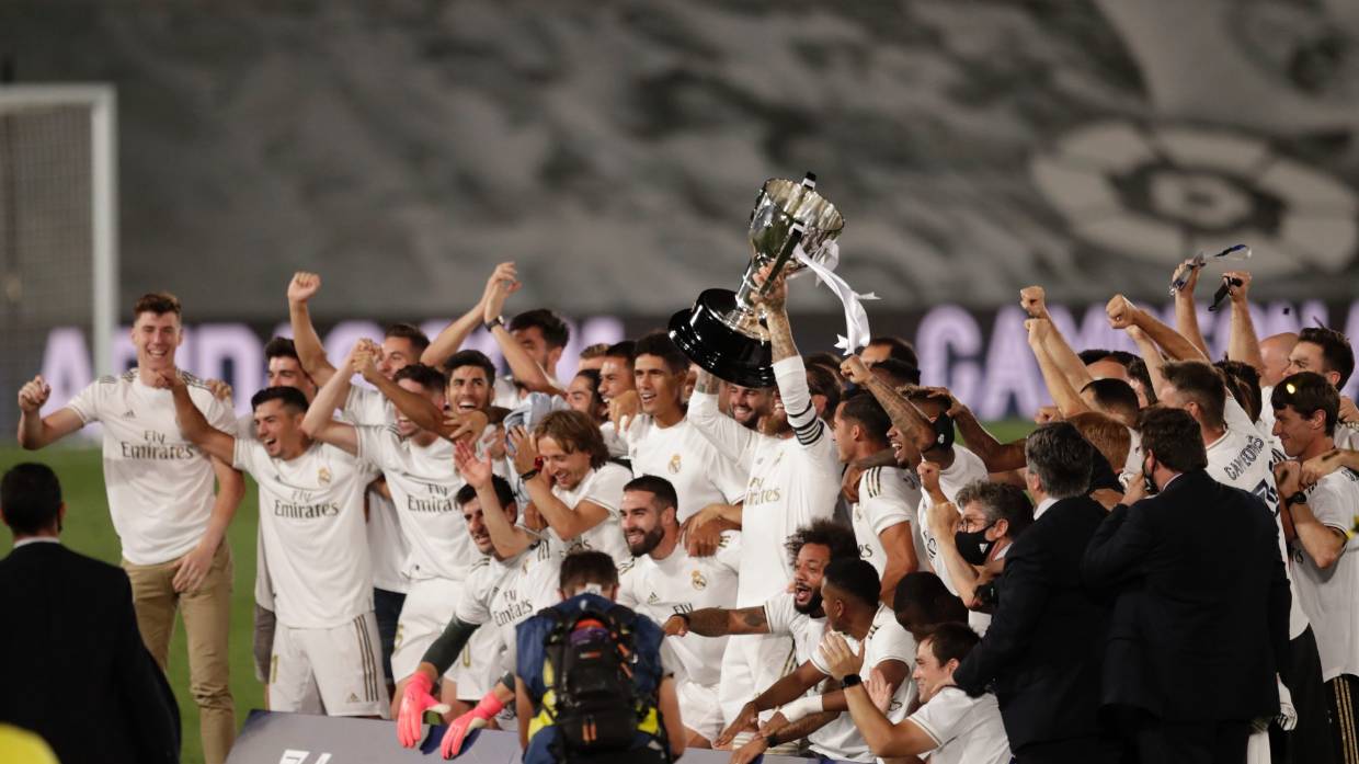 The title celebrations were subdued as the triumph came with Madrid playing without fans and at their training centre because the Santiago Bernabeu Stadium is undergoing renovation work.