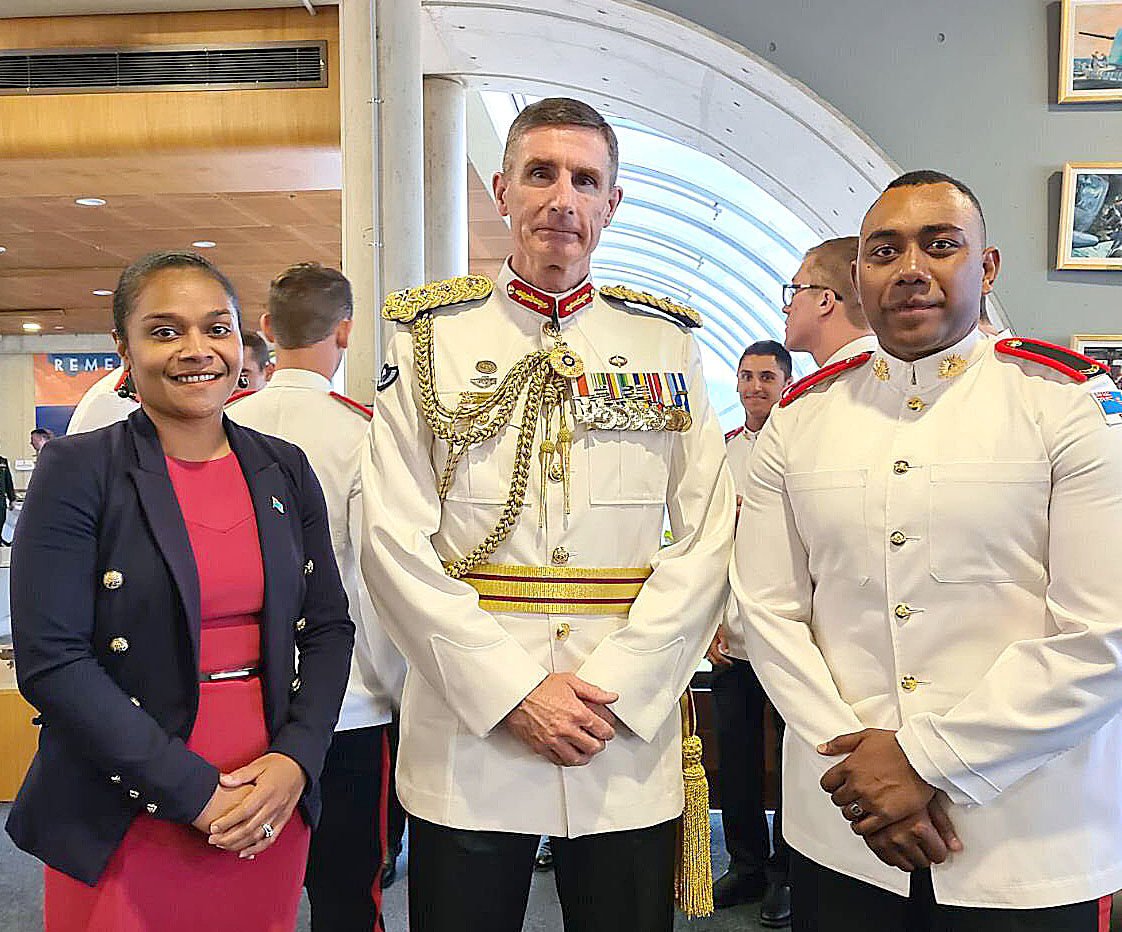 Australian Chief of the Defence Force – General Angus Campbell with 2LT Rusiate Sailo – Fiji and RFMF’s Pioneer ADFA graduate and Counsellor Salote Tagivakatini representing the High Commission of the Republic of Fiji to Australia. Picture: SUPPLIED