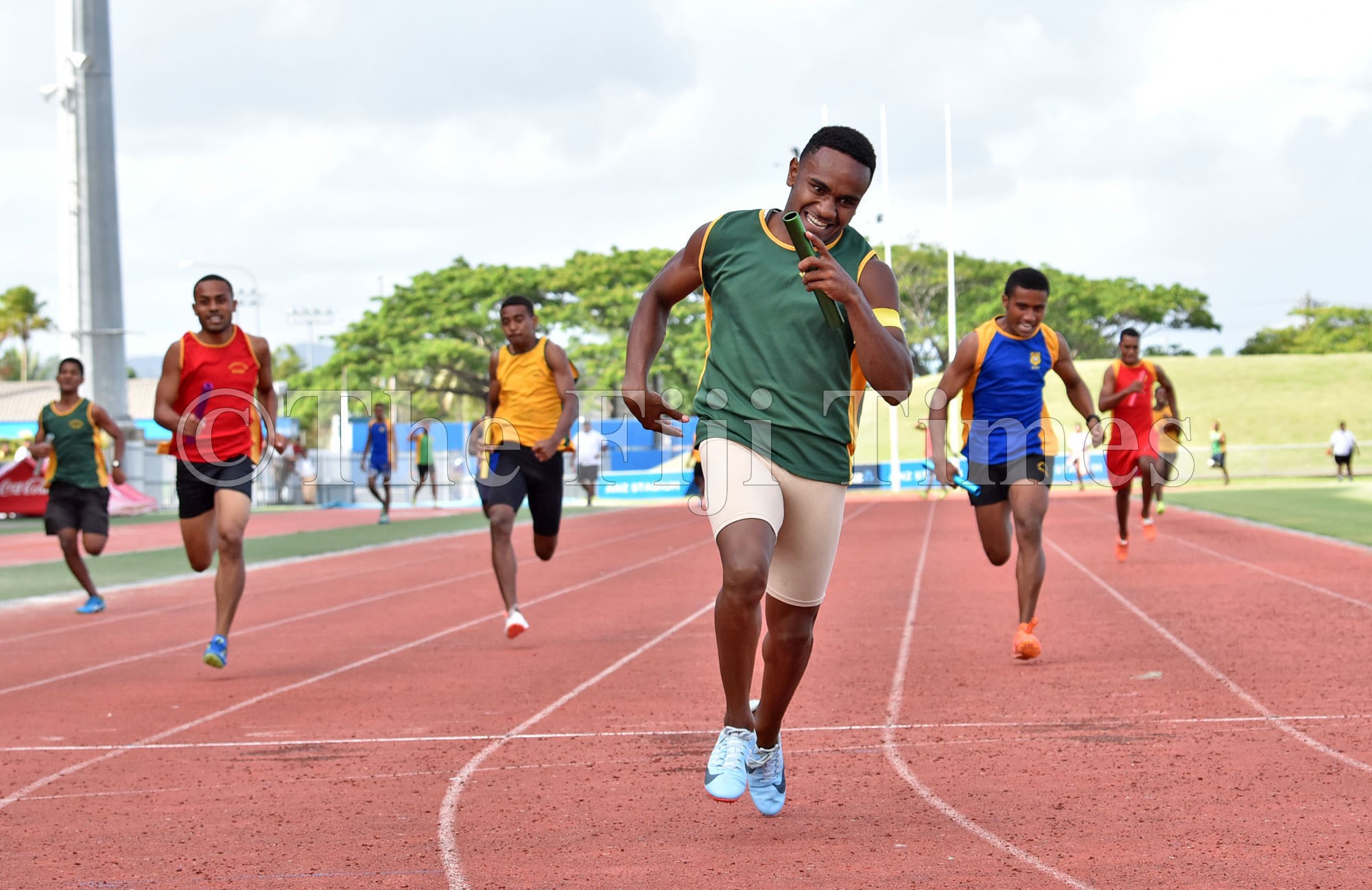 Vereniki Koroi of Nakauvadra House (Green) reaches the fi nish line ahead of other athletes in the senior boys 4×100 metre fi nal during the Ratu Sukuna Memorial School inter-house competition at the ANZ Stadium in Suva yesterday. Picture: JONACANI LALAKOBAU
