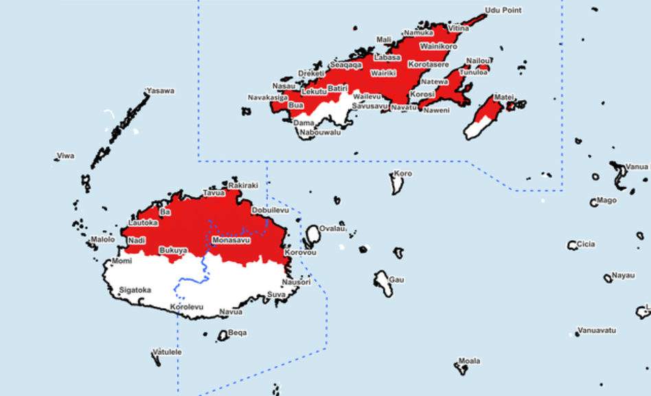 A severe thunderstorm warning is now in force for the northern half of Viti Levu, from Nadi through Rakiraki to Korovou, and the eastern half of Vanua Levu, covering areas from northern Bua through Labasa to Udu Point, as well as Wailevu through Savusavu to Saqani, including Natewa.