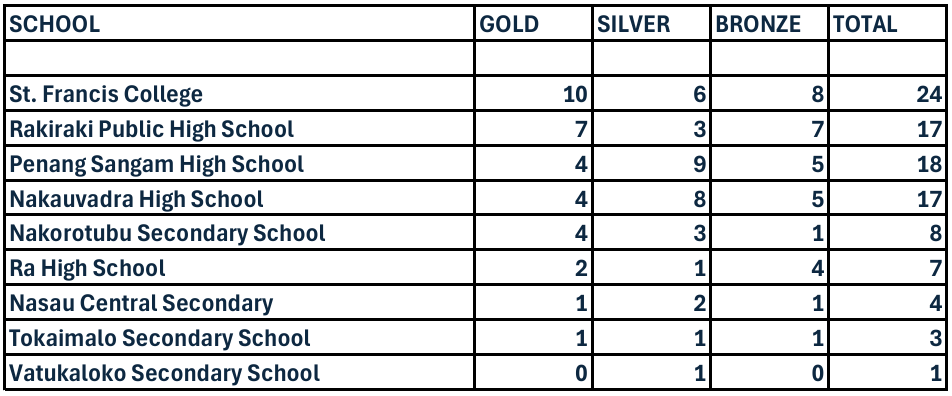 Rakiraki Public High School follows closely in second with seven gold, three silver and seven bronze.