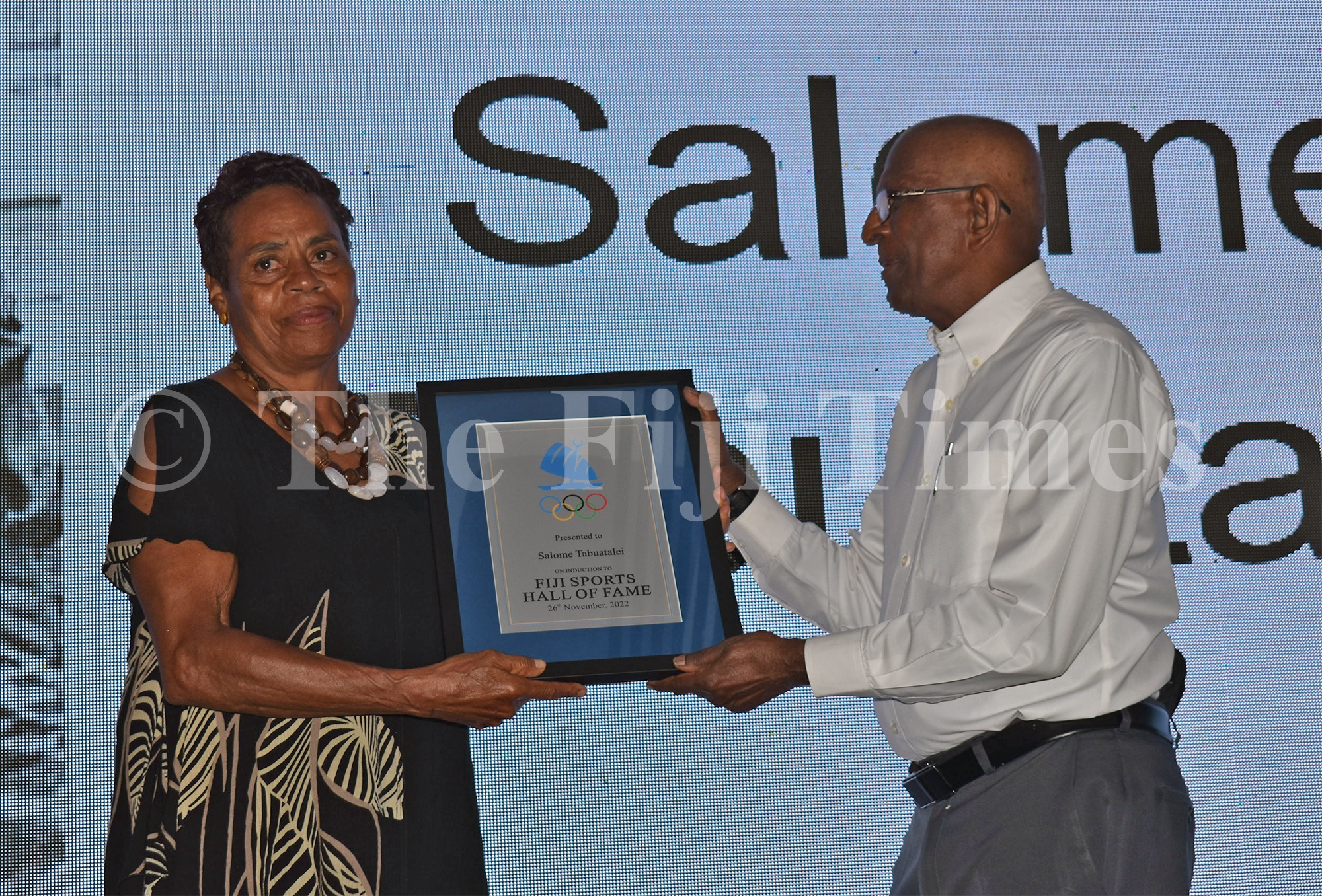 Fiji Sports Hall of Fame inductee, Salome Tabuatalei receives her award from Vidya Lakhan during the awards night at the Grand Pacific Hotel in Suva on Friday, November 02, 2022. Picture: JONACANI LALAKOBAU