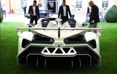 A white 2014 Lamborghini Veneno Roadster, with the initials TNO painted on the hood and ‘gull wing’ doors, is the star lot, valued at 5.2 million to 6.2 million Swiss francs. One of only nine made, it has 325 km (200 miles) on the clock, and was being inspected by a potential German bidder kneeling in the grass.