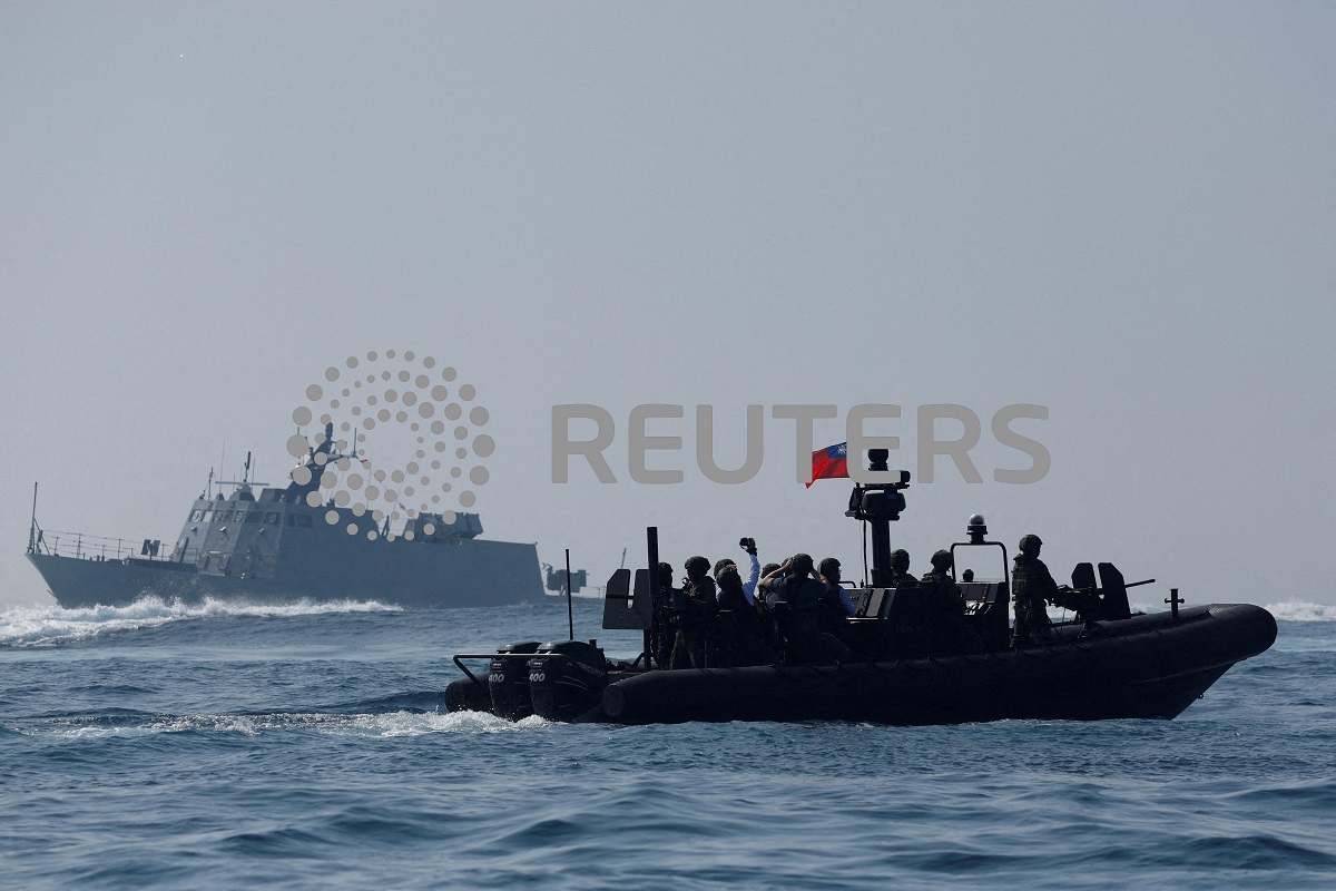 Members of Taiwan’s Navy and media onboard a special operation boat navigate near a Kuang Hua VI-class missile boat, during a drill part of a demonstration for the media, to show combat readiness ahead of the Lunar New Year holidays, on the waters near a military base in Kaohsiung, Taiwan January 31, 2024. REUTERS/Carlos Garcia Rawlins