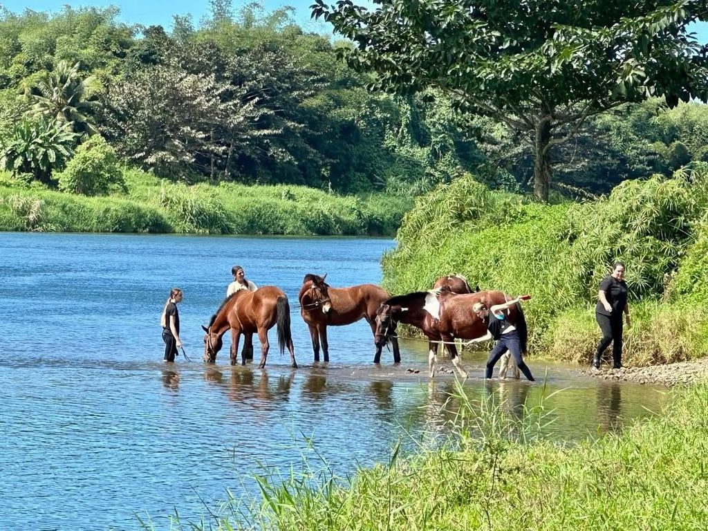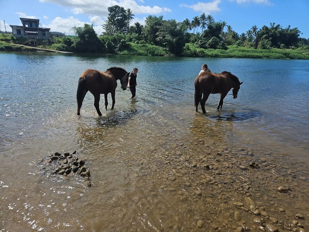 Riders and the horses stop by the Navua river to cool off and take a breather.