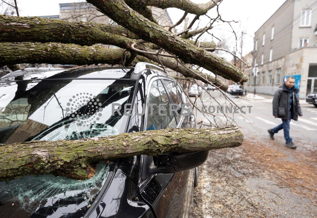 Fallen branches on a car a day after freezing rain and strong winds cut power to more than a million people in Canada’s two most populated provinces, in Montreal, Quebec, Canada, April 6, 2023. REUTERS/Christinne Muschi