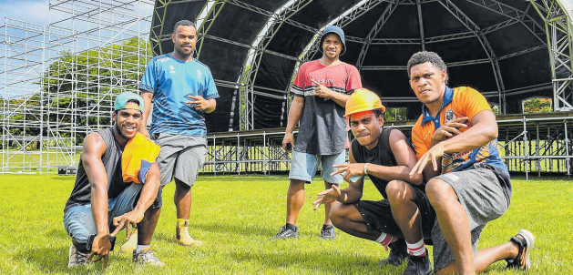 Stage crew William Johns (left), Andrew Niudamu, Mikaele Silatolu, Netani Bulimairewa and Aisea Raibevu work on the setup of the stage for the upcoming UB40 concert at Prince Charles Park in Nadi. Picture: REINAL CHAND