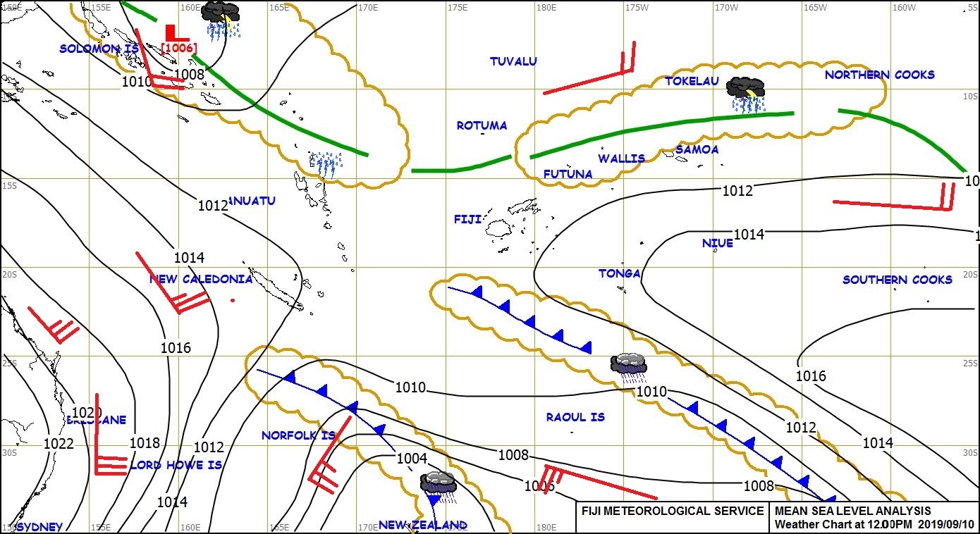The forecast to midnight tomorrow for the Fiji group expect occasional showers with isolated heavy falls and thunderstorms expected over Northern Lau group, Vanua Levu, the eastern parts and interior of the other larger islands.